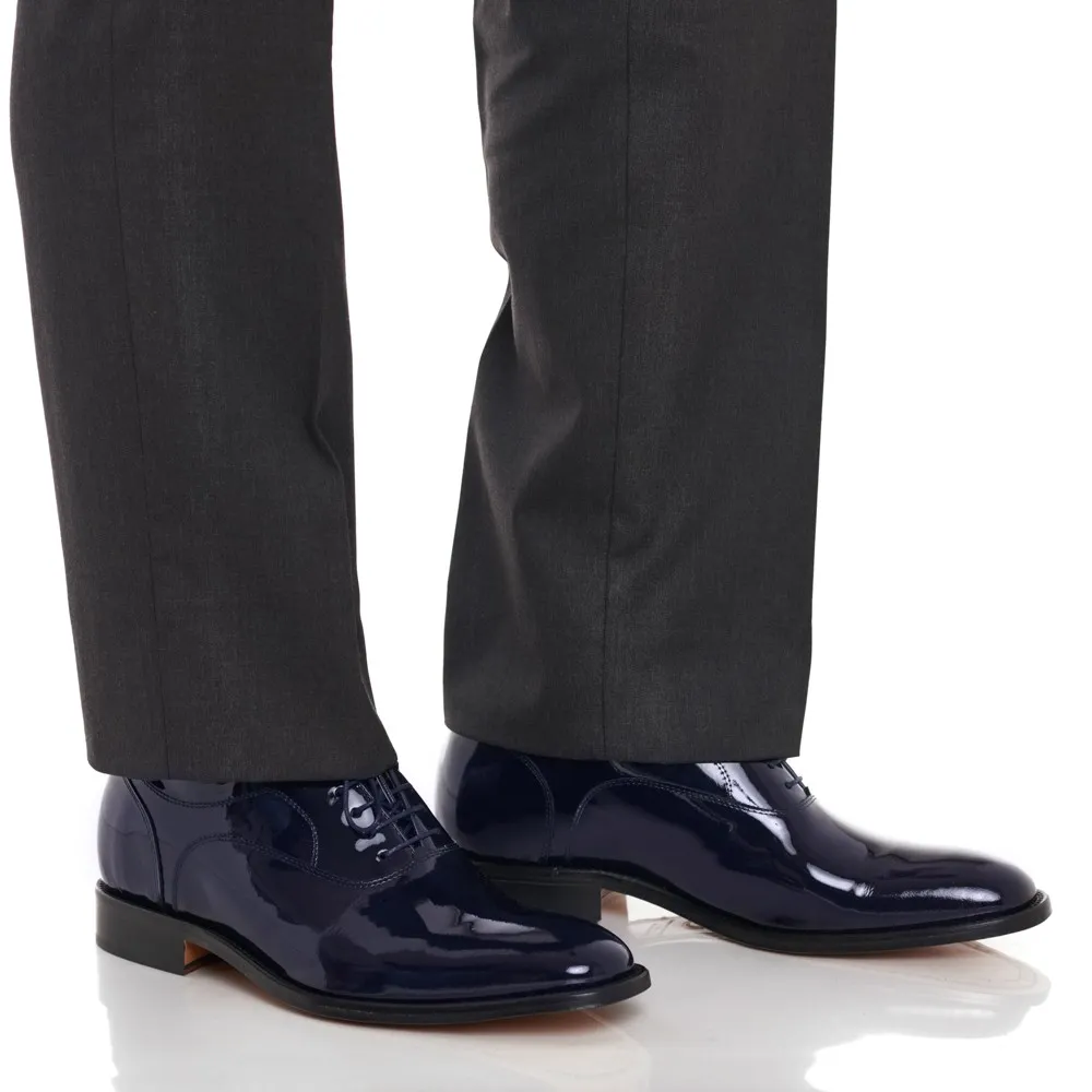 Die blauen Lackschuhe sind aus behandeltem Glattleder, Lack und Leinöl gefertigt und haben außerdem ein Obermaterial aus Kalbsleder tafilete. -