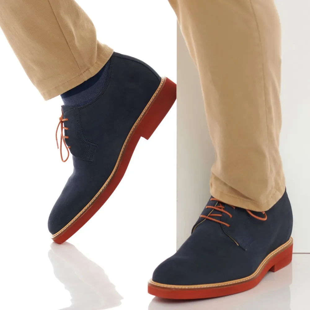 Schuhe mit Innen-Erhöhung. Außen aus wasserabweisendem Wildleder. Einlegesohle aus Leder, die Unebenheiten absorbiert.