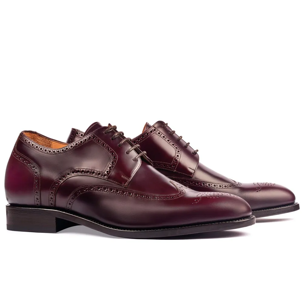 Descripción: Los zapatos cordovan con cordones Atlanta burgundy son una edición especial de zapatos Oxford con alzas de alta calidad. Están diseñados con un exterior de piel cordovan, que les confiere elegancia y durabilidad. El interior está totalmente forrado en fina piel, garantizando un confort excepcional durante todo el día. El distintivo diseño picado o brogue de Atlanta agrega un toque de carácter y estilo único a estos zapatos.