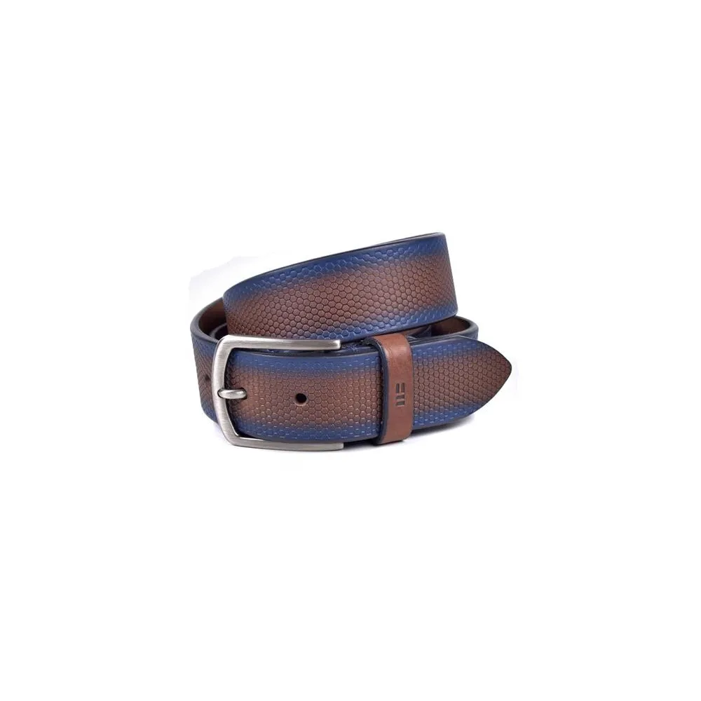 Descrizione: Stefano è una cintura da uomo sportiva in marrone con contorno blu. Questa cintura per jeans da uomo presenta un disegno esagonale sul corpo della cintura che gli conferisce personalità e design. I colori si sfumano lungo la cintura creando un contrasto armonioso. È una cintura molto bella.